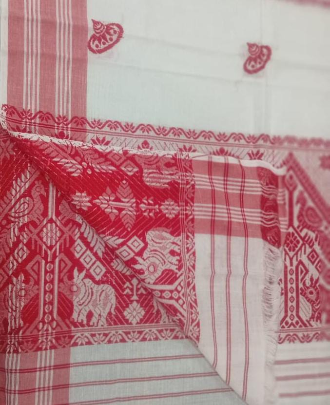 ![]() Description : The Gamosa Is A Multipurpose Cloth That Can Be Used As A Towel, Handkerchief, Head Covering, Waistband, Or Even As A Gift Wrapper. It Is An Important Part Of Assamese Culture And Is Used In Various Social, Cultural, And Religious Ceremonies. The Gamosa Is Also A Symbol Of Hospitality, Friendship, And Respect. Location : Assam, India