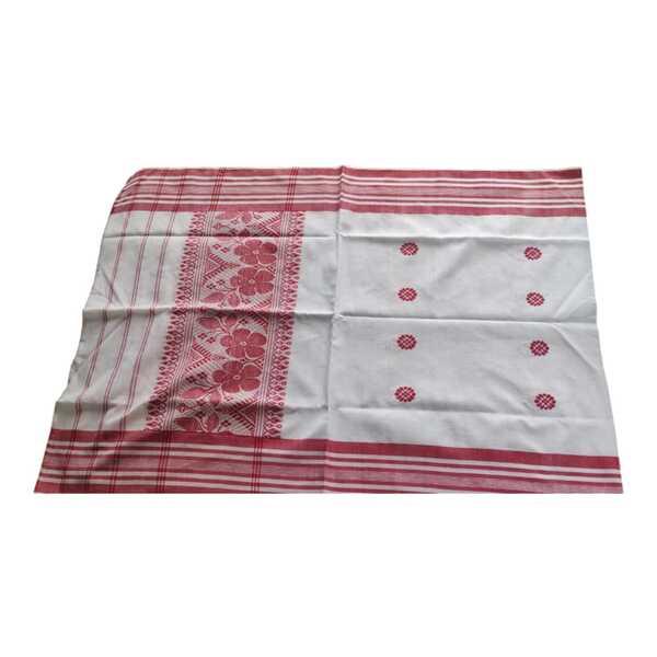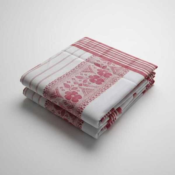 The specialty of the Assamese Gamosa lies in its cultural significance as a symbol of respect and hospitality, a traditional handwoven cotton cloth, and its versatile use for wiping, gifts, and ceremonial purposes. Location : Assam, India