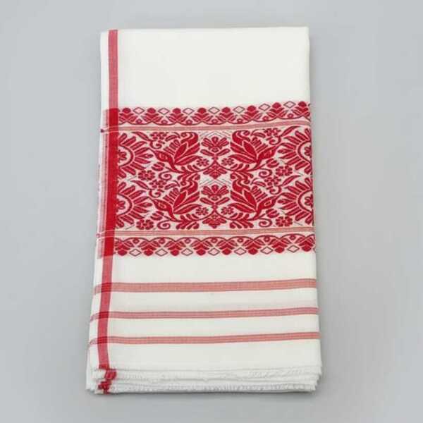 The Rabha gamosa, a traditional Assamese handwoven cloth, is a rectangular piece of fabric, often white with red borders on three sides and woven motifs on the fourth, used as a symbol of respect, gratitude, and affection, and is a multipurpose item used for various purposes.
