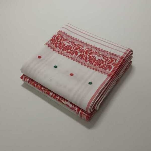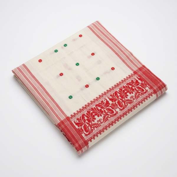 The Gamosa, a traditional Assamese handwoven cloth, is a rectangular piece of white cotton fabric with red or maroon borders and often features woven motifs, serving as a symbol of respect, hospitality, and cultural identity Location : Assam, India