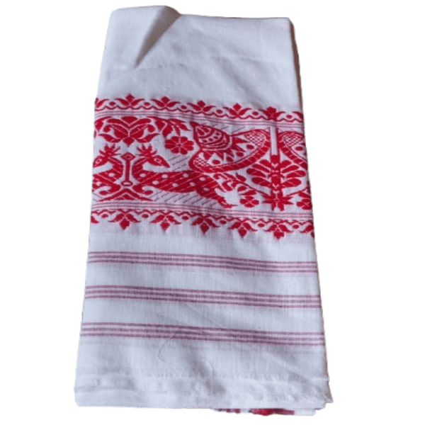 ![]() Description : The Gamosa, A Culturally Significant Handwoven Cloth From Assam, Is A White Rectangular Piece Of Fabric With Red Or Maroon Borders And Often Features Intricate Woven Motifs, Serving As A Symbol Of Respect, Hospitality, And Cultural Identity. Location : Assam, India