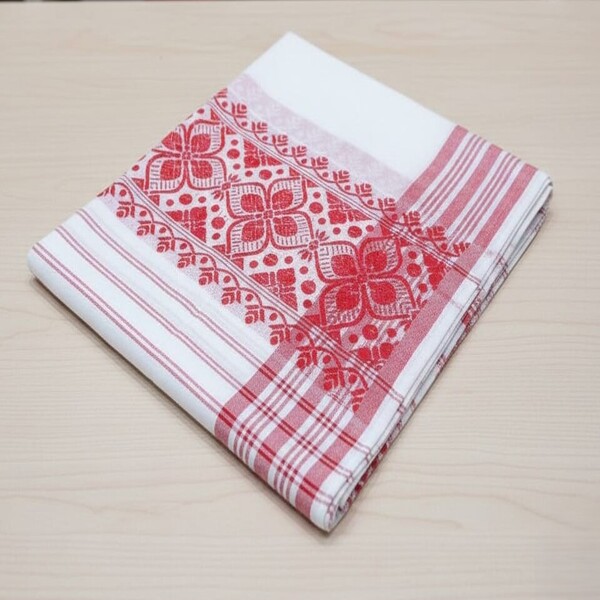 The Gamosa, a culturally significant handwoven cloth from Assam, is a white rectangular piece of fabric with red or maroon borders and often features intricate woven motifs, serving as a symbol of respect, hospitality, and cultural identity. Location : Assam, India