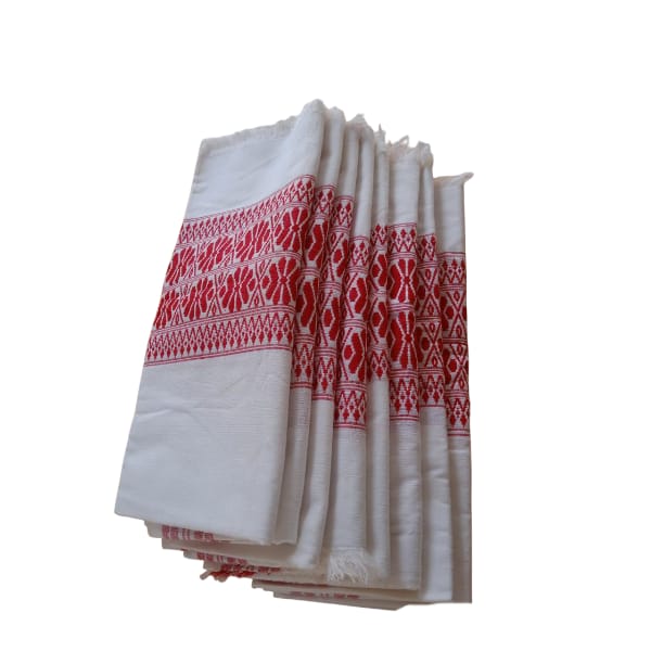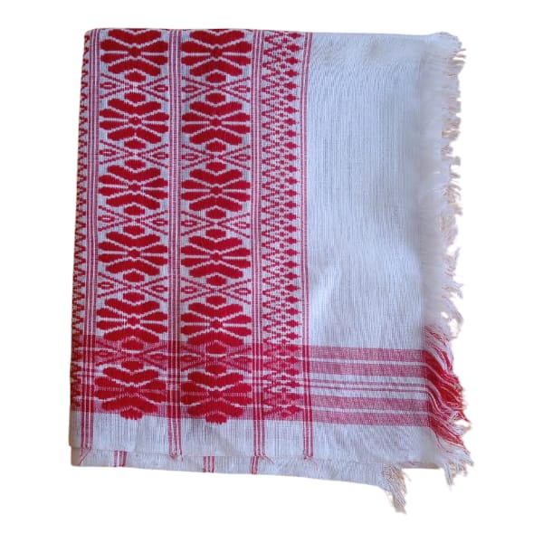 The Gamosa, a traditional Assamese handwoven cloth, is a white rectangular piece of fabric with red or maroon borders and often features woven motifs, serving as a symbol of respect, hospitality, and cultural identity, particularly in Assam. Location : Assam, India