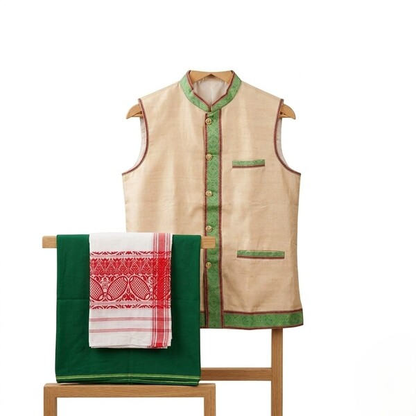 A traditional waistcoat, also known as a vest, is a sleeveless, waist-length garment worn over a dress shirt and under a suit jacket, typically featuring a V-neckline and buttoned front. Location : Assam, India