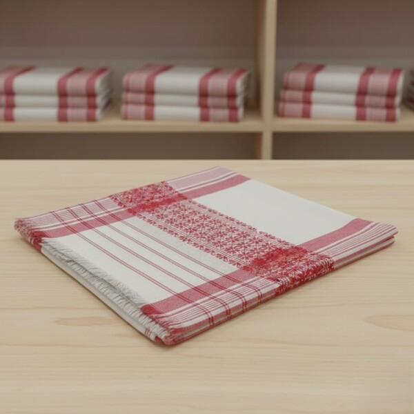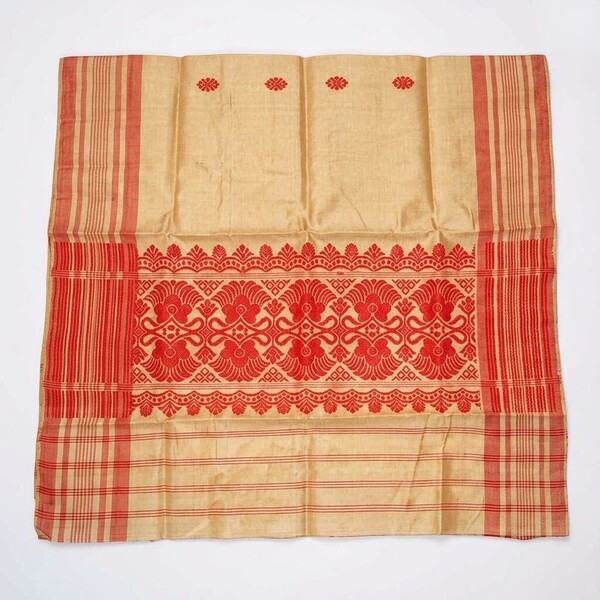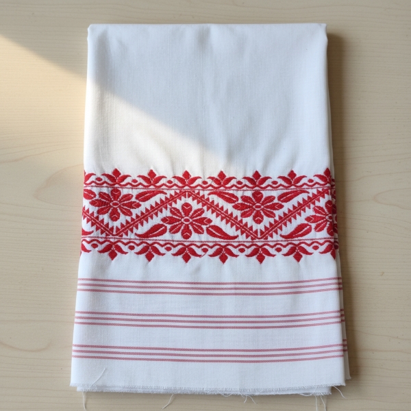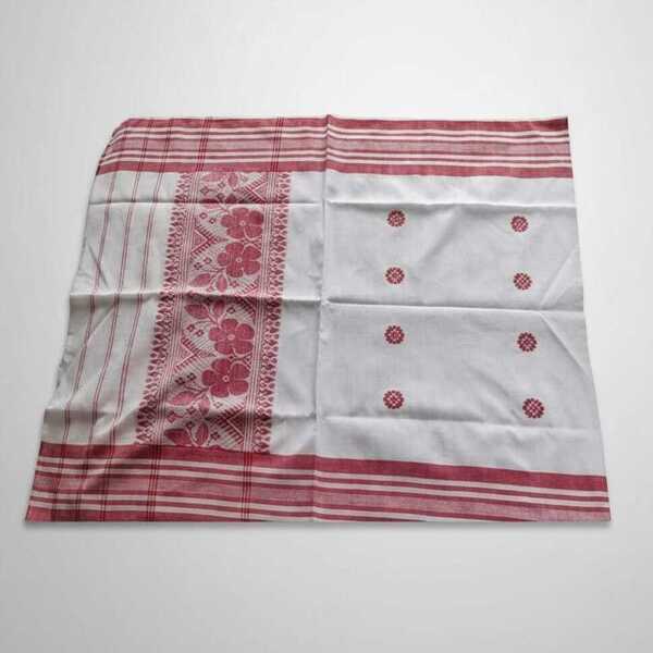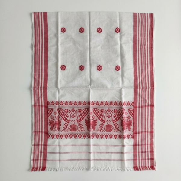 The Gamosa, a traditional handwoven cotton cloth from Assam, is a white rectangular piece with red or maroon borders and may feature decorative motifs, serving as a symbol of hospitality, friendship, and respect, and used in various cultural and religious ceremonies. Location : Assam, India