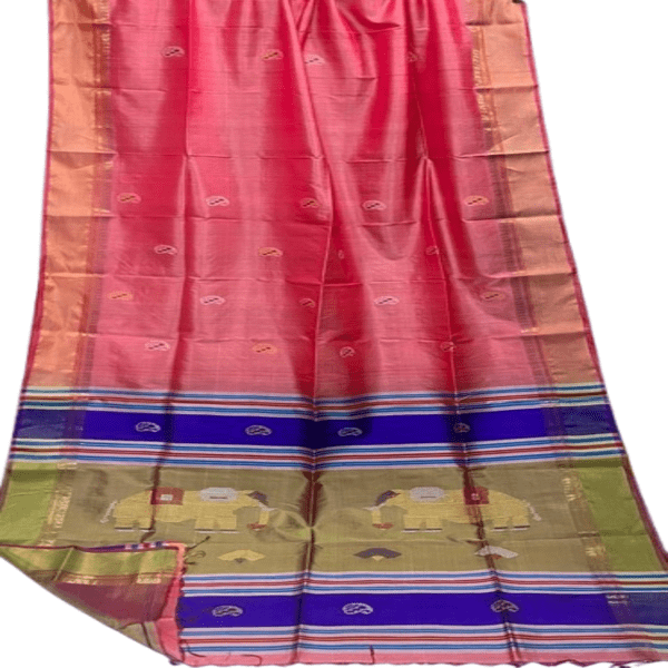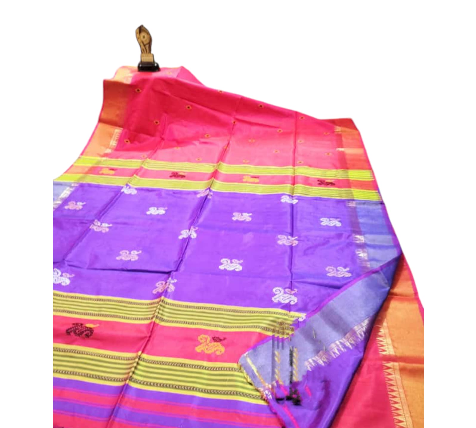![]() Description : Kosa Silk Sarees Are Traditional Indian Sarees Crafted From A Unique Silk Fabric Sourced From The Cocoons Of The Wild Antheraea Mylitta Silkworm. They Are Known For Their Distinctive Golden-brown Hue, Lustrous Appearance, Fine Texture, And Intricate Designs. Kosa Silk Is Also Known As Tussar Silk Or Champa Silk. Location : Chhatisgarh, India