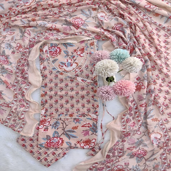 1705 Set Description : A 3-piece Salwar Suit Fabric Set Includes Unstitched Or Semi-stitched Fabric For The Kameez (top), Salwar (bottom), And Dupatta (scarf). These Sets Are Available In Various Materials Like Cotton, Silk, Georgette, Or Chiffon, And Often Feature Embroidery, Prints, Or Embellishments, Allowing For Custom Tailoring And Personalized Styling. Location : Jharkhand, India