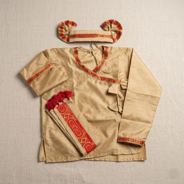 A cotton Mekhela Chador is a two-piece traditional Assamese attire for women, typically made of comfortable cotton. The Mekhela is a wide, cylindrical piece of cloth folded into pleats and draped around the waist like a sarong. The Chadar, or Sador, is a long, unstitched cloth that is draped over the shoulder, with one end tucked into the upper part of the Mekhela. Location : Assam, India