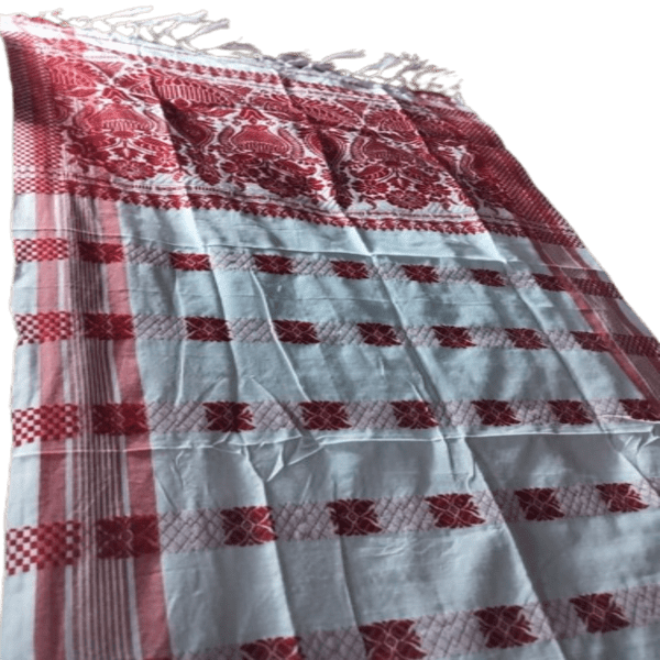 286 Piece Description : A Fulam Gamosa Is A Traditional Assamese Towel Or Scarf, Typically White With Red Borders, That Is Woven With Intricate Floral Motifs On Both Sides. It Is A Symbol Of Respect And Hospitality, Often Used In Ceremonies And Presented As A Gift. The Fulam Refers To The Floral Patterns Woven Into The Fabric. Location : Assam, India