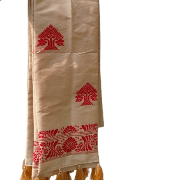 ![]() Description : A Toss Muga Gamusa Is A Traditional Assamese Scarf, Typically Made From Pure Muga Silk, A Golden-colored, Durable Fabric Prized In Assam. It Is An Important Symbol Of Assamese Culture, Used As A Gift, For Respect, Or In Ceremonies. The Gamusa Is Often Woven With Intricate Designs, And Is Typically Worn Around The Neck Or Shoulders. Location : Assam, India