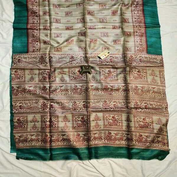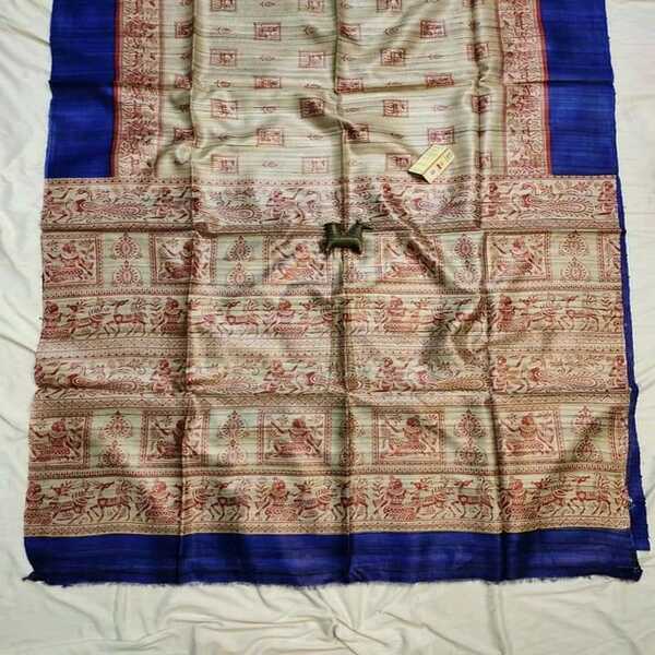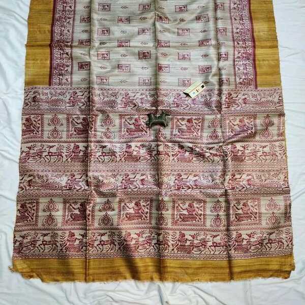 5135 Piece Description : A Tussar Ghicha Screen Print Saree Is A Handwoven Silk Saree That Incorporates A Screen Printing Technique Onto The Ghicha Tussar Silk Fabric. Ghicha Silk, A Byproduct Of Tussar Silk, Is Known For Its Natural Texture And Lustrous Feel. The Screen Printing Adds Intricate Designs, Often In Vibrant Colors, To The Saree, Making It A Unique Blend Of Traditional Craftsmanship And Modern Artistry. Location : Jharkhand, India