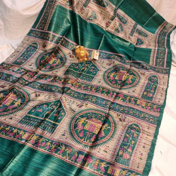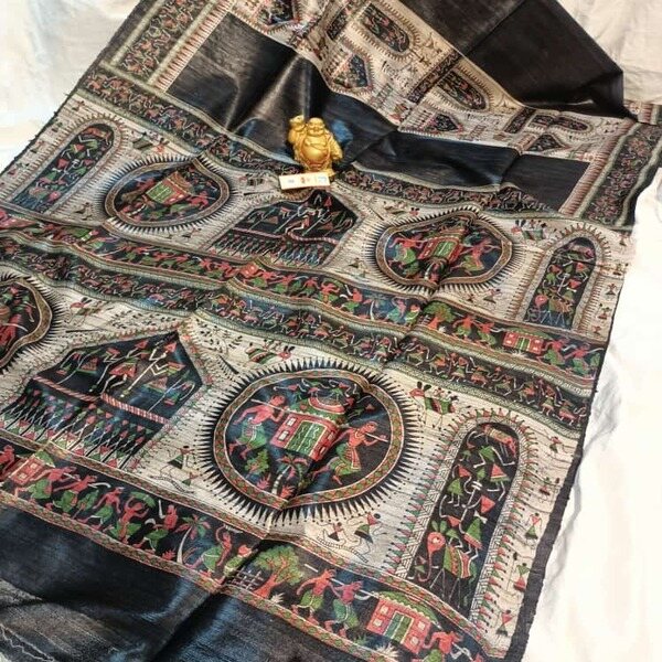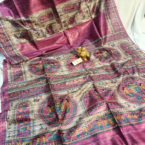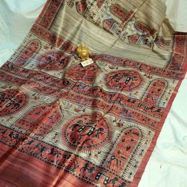 5395 Piece Description : A Tussar Ghicha Madhubani Hand Print Saree Is A Beautiful Blend Of Rustic Elegance And Traditional Art. Made From Natural Tussar And Ghicha Silk, It Features Hand-printed Madhubani Motifs Inspired By Indian Folklore And Nature. The Rich Texture Of The Fabric Combined With Intricate Artwork Gives It A Graceful Ethnic Appeal, Perfect For Festive And Cultural Occasions. Location : Jharkhand, India