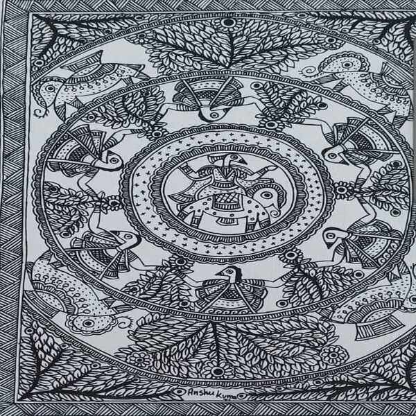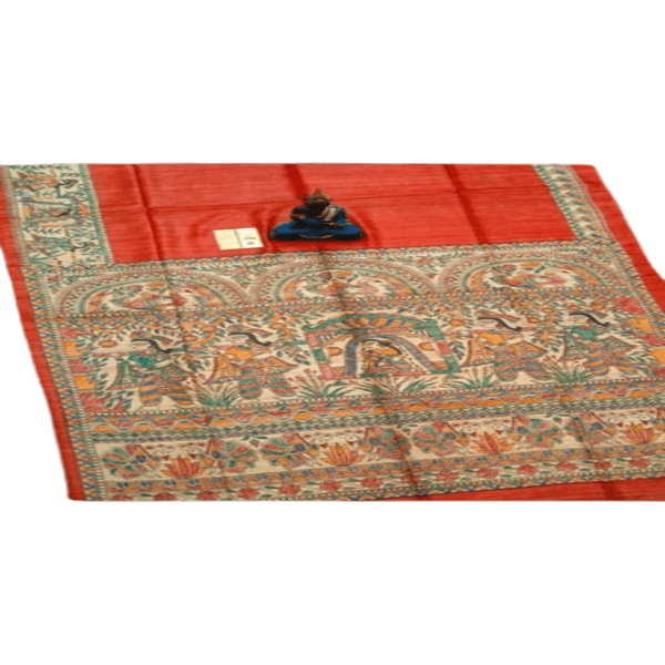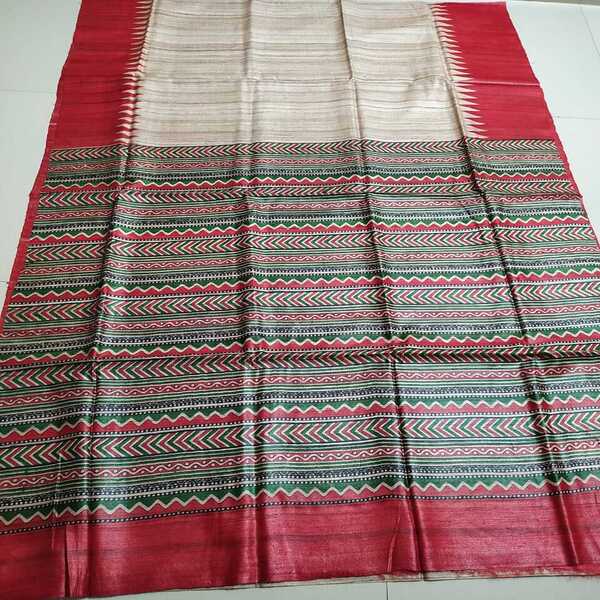 ![]() Description : A Tussar Ghicha Madhubani Hand Print Saree Is A Beautiful Blend Of Rustic Elegance And Traditional Art. Made From Natural Tussar And Ghicha Silk, It Features Hand-printed Madhubani Motifs Inspired By Indian Folklore And Nature. The Rich Texture Of The Fabric Combined With Intricate Artwork Gives It A Graceful Ethnic Appeal, Perfect For Festive And Cultural Occasions. Location : Jharkhand, India