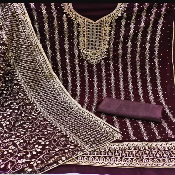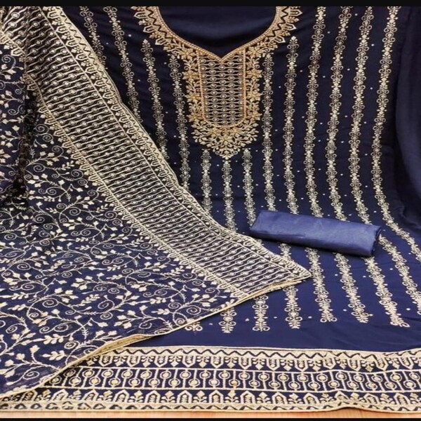 ![]() Description : A Georgette Salwar Suit Is A Classic Indian Ethnic Ensemble Distinguished By Its Use Of Georgette Fabric, Known For Its Lightweight, Crinkled Texture And Elegant Drape, Offering Both Comfort And Sophistication. This Versatile Outfit, Typically Comprising A Kameez (tunic), Salwar (trousers), And A Matching Dupatta (scarf), Comes In A Vast Array Of Designs, From Vibrant Prints And Simple Styles For Daily Wear To Richly Embroidered And Embellished Versions Ideal For Festive Events And Formal Occasions, All While Providing A Breathable And Flattering Silhouette For Various Body Types. Location : Gujarat, India