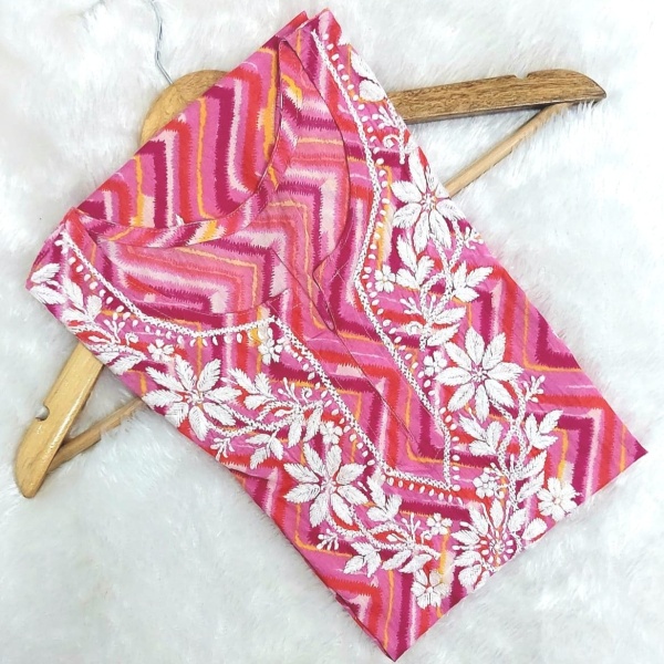 659 Piece Description : A Leheriya Print Embroidered Chikankari Short Top Is A Short-length Top That Combines A Vibrant, Wavy Leheriya Print With Intricate, Hand-embroidered Chikankari Work, Creating A Unique And Stylish Fusion Of Traditional Indian Crafts. The Leheriya Pattern Is A Colorful, Tie-dye Technique From Rajasthan, While The Chikankari Is A Delicate Hand-embroidery Style From Lucknow, Often Featuring Floral Or Paisley Motifs. These Elements Are Combined To Create A Top That Is Both Lively And Elegant, Perfect For Casual Or Festive Wear. Location : Uttar Pradesh, India
