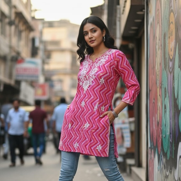 659 Piece Description : A Leheriya Print Embroidered Chikankari Short Top Is A Short-length Top That Combines A Vibrant, Wavy Leheriya Print With Intricate, Hand-embroidered Chikankari Work, Creating A Unique And Stylish Fusion Of Traditional Indian Crafts. The Leheriya Pattern Is A Colorful, Tie-dye Technique From Rajasthan, While The Chikankari Is A Delicate Hand-embroidery Style From Lucknow, Often Featuring Floral Or Paisley Motifs. These Elements Are Combined To Create A Top That Is Both Lively And Elegant, Perfect For Casual Or Festive Wear. Location : Uttar Pradesh, India