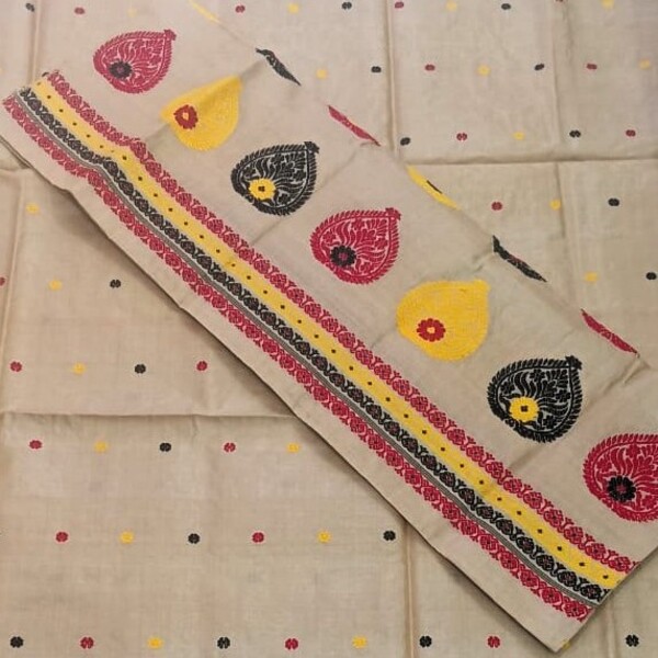 11050 Set Description : A Pure Toss Mekhela Chadar Is A Traditional Assamese Outfit Made From 100% Tussar Silk, A Natural Silk Known For Its Golden Sheen And Coarse Texture. It Is A Two-piece Garment Consisting Of A Mekhela (a Cylindrical Sarong-like Piece Wrapped Around The Waist) And A Chadar (a Long Piece Of Fabric Draped Over The Body, Similar To A Sari). The Set Typically Includes A Separate Blouse Piece. Location : Assam, India