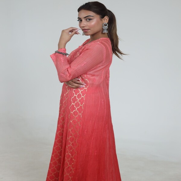 A chikankari anarkali is a traditional Indian outfit featuring the elegant Anarkali silhouette enhanced by chikankari, a delicate hand embroidery technique from Lucknow. This style combines the graceful, floor-length flow of the anarkali with the intricate, often white-on-pastel, hand-stitched patterns of chikankari, creating a dress that is both classic and sophisticated. Location : Uttar Pradesh, India