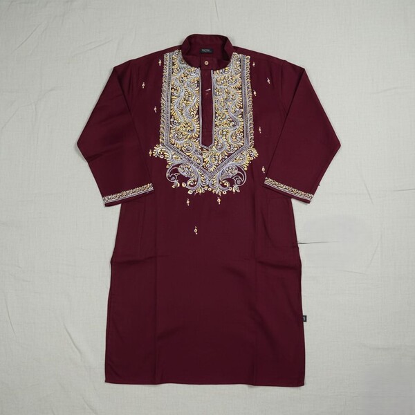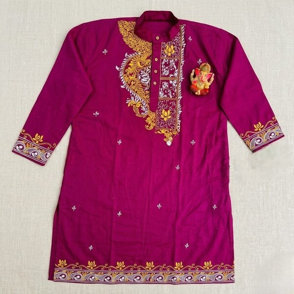 A Kalka Punjabi kurta is a mens long, loose-fitting tunic made of fabric like cotton or khadi cotton, often handcrafted with a Kalka or paisley-like embroidery or hand-painted design. The Kalka refers to the intricate pattern, which are hand-painted or embroidered, making it a decorative, festive, or formal ethnic wear option. Location : West Bengal, India