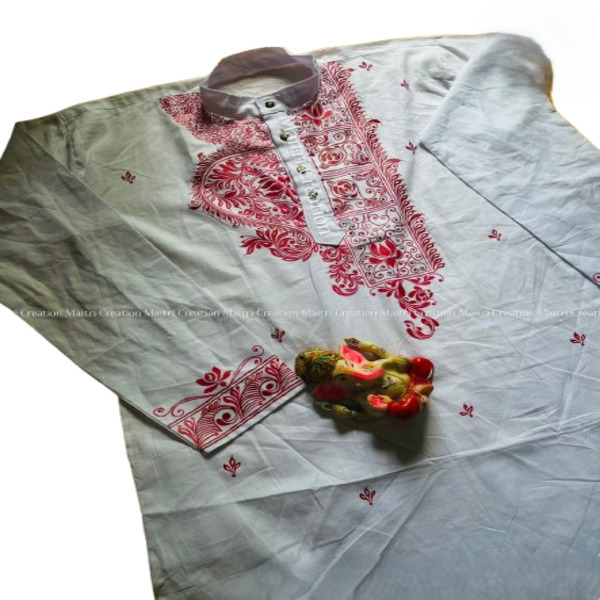 935 Piece Description : A Kalka Punjabi Kurta Is A Mens Long, Loose-fitting Tunic Made Of Fabric Like Cotton Or Khadi Cotton, Often Handcrafted With A Kalka Or Paisley-like Embroidery Or Hand-painted Design. The Kalka Refers To The Intricate Pattern, Which Are Hand-painted Or Embroidered, Making It A Decorative, Festive, Or Formal Ethnic Wear Option. Location : West Bengal, India