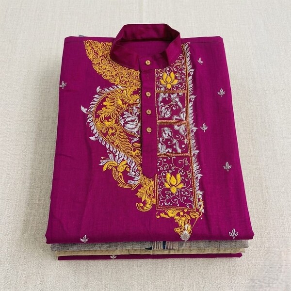 A Kalka Punjabi kurta is a mens long, loose-fitting tunic made of fabric like cotton or khadi cotton, often handcrafted with a Kalka or paisley-like embroidery or hand-painted design. The Kalka refers to the intricate pattern, which are hand-painted or embroidered, making it a decorative, festive, or formal ethnic wear option. Location : West Bengal, India