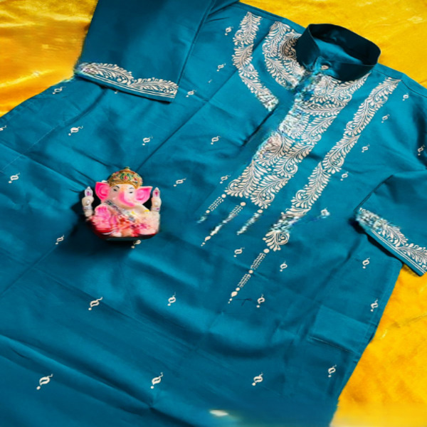 A Kalka Punjabi kurta is a mens long, loose-fitting tunic made of fabric like cotton or khadi cotton, often handcrafted with a Kalka or paisley-like embroidery or hand-painted design. The Kalka refers to the intricate pattern, which are hand-painted or embroidered, making it a decorative, festive, or formal ethnic wear option. Location : West Bengal, India