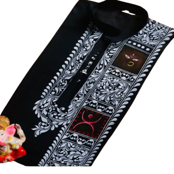 A Kalka Punjabi kurta is a mens long, loose-fitting tunic made of fabric like cotton or khadi cotton, often handcrafted with a Kalka or paisley-like embroidery or hand-painted design. The Kalka refers to the intricate pattern, which are hand-painted or embroidered, making it a decorative, festive, or formal ethnic wear option. Location : West Bengal, India