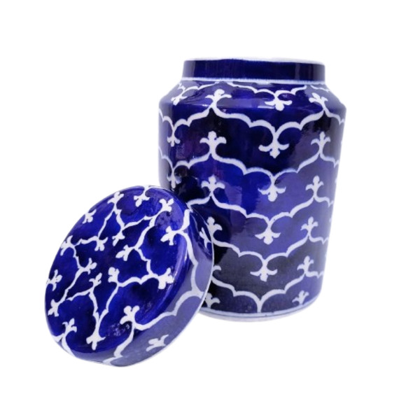 990 Piece Description : A Blue Pottery Canister Is A Handcrafted Storage Container, Often From Jaipur, India, Made From A Special Mix Of Quartz Powder, Glass Powder, And Other Natural Ingredients Instead Of Clay. It Is Characterized By Its Eye-catching Vibrant Blue Colour, Intricate Hand-painted Designs, And Unique Low-fired, Glazed Finish. These Canisters Are Suitable For Storing Dry Goods Like Pasta, Sugar, Or Cookies And Are Considered A Durable, Beautiful, And Eco-friendly Decorative Item. Location : Rajasthan, India