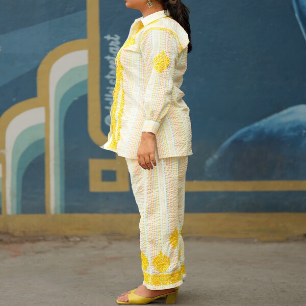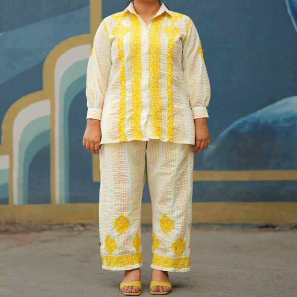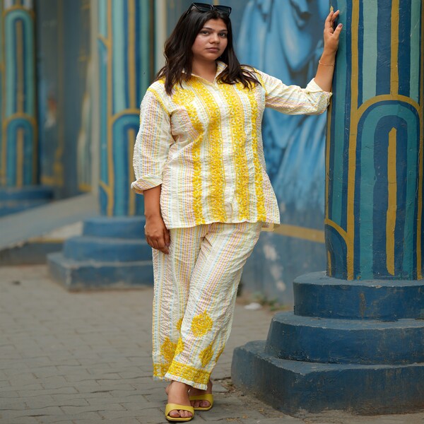 A chikankari crushed co-ord set is a stylish and comfortable two-piece outfit that elegantly merges traditional Indian craftsmanship with a modern, relaxed aesthetic. The ensemble features intricate, handcrafted Chikankari embroidery, typically done in delicate white thread, detailing floral or traditional motifs across the top and bottom pieces. The unique crushed texture of the fabric—often a soft, breathable cotton or rayon—provides a distinct, permanently crinkled look that offers ease of movement, requires minimal care (no ironing needed), and adds a contemporary, relaxed flair to the traditional artistry. This fusion creates a versatile outfit suitable for a variety of occasions, from casual day wear to semi-formal events. Location : Uttar Pradesh, India