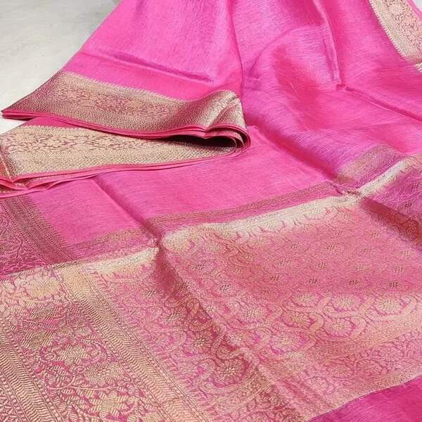 3250 Piece Description : A Linen Banarasi Saree Is A Luxurious And Comfortable Fusion Garment That Blends The Rustic Elegance And Breathability Of Natural Linen Fabric With The Rich, Traditional Artistry Of Banarasi Weaving Techniques, Which Are Famous For Their Intricate Motifs And Opulent Zari Borders. These Sarees Are Lightweight And Feature A Sheer, Soft Texture That Drapes Beautifully And Is Ideal For Warmer Climates. The Weave Incorporates Signature Mughal-inspired Designs And Detailed Craftsmanship But Utilizes Strong, Durable Linen Fibres, Making The Resulting Saree Both A Resilient And Elegantly Understated Piece Of Ethnic Wear. Location : Bihar, India