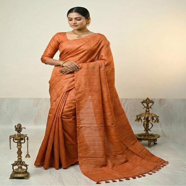 4680 Piece Description : A Pure Tussar Hand Block Printed Saree Is A Luxurious And Artisanal Garment That Combines The Rustic Elegance Of Wild Silk With The Intricate Beauty Of Traditional Handcrafted Motifs. Tussar Silk Is Highly Prized For Its Unique Natural Golden Sheen, Slightly Coarse Slub Texture, And Breathability, Offering Both Comfort And A Sophisticated Drape That Becomes Softer Over Time. The Hand Block Printing Process Involves Skilled Artisans Manually Stamping Delicate Or Bold Patterns Onto The Fabric Using Carved Wooden Blocks, Resulting In One-of-a-kind Designs—often Featuring Floral, Paisley, Or Geometric Motifs—where Minor Variations In The Print Serve As Authentic Hallmarks Of Traditional Craftsmanship. The Final Product Is A Timeless Statement Piece That Perfectly Balances Raw, Organic Texture With Refined, Intricate Artistry. Location : West Bengal, India