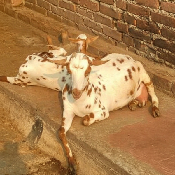 13200 No. Description : The Barbari Goat Is A Small, Compact, Dual-purpose (milk & Meat) Breed Known For Its Hardiness, High Prolificacy (twins/triplets), And Adaptability, Typically Featuring A White Coat With Reddish-brown Spots, Short Ears, And Often Twisted Horns, Thriving In Dry Regions Like North India And Pakistan. Location : Uttar Pradesh, India