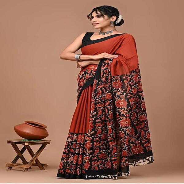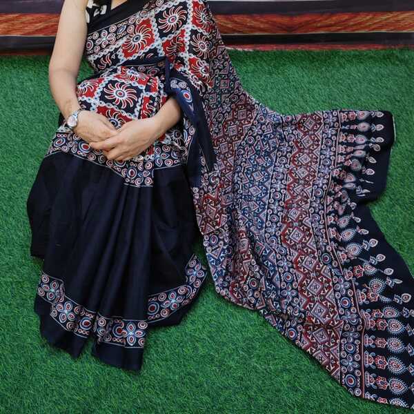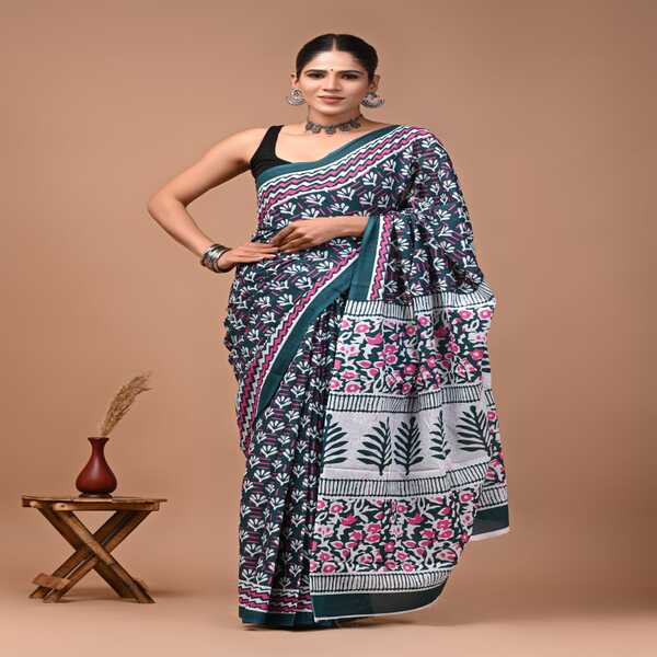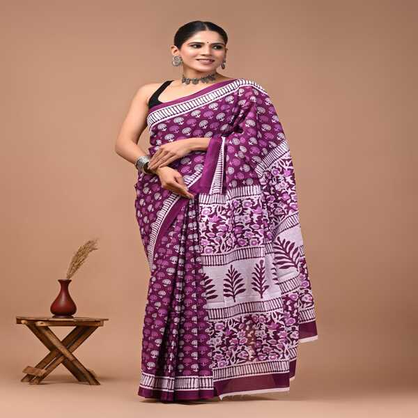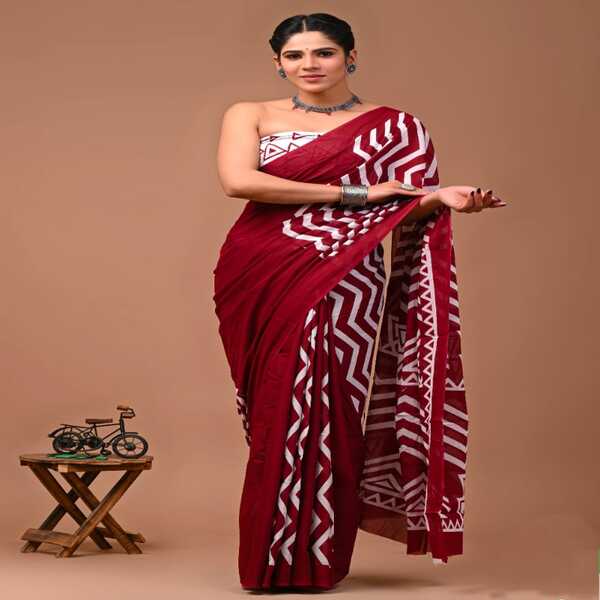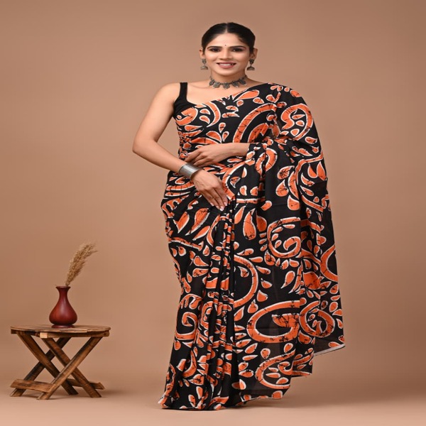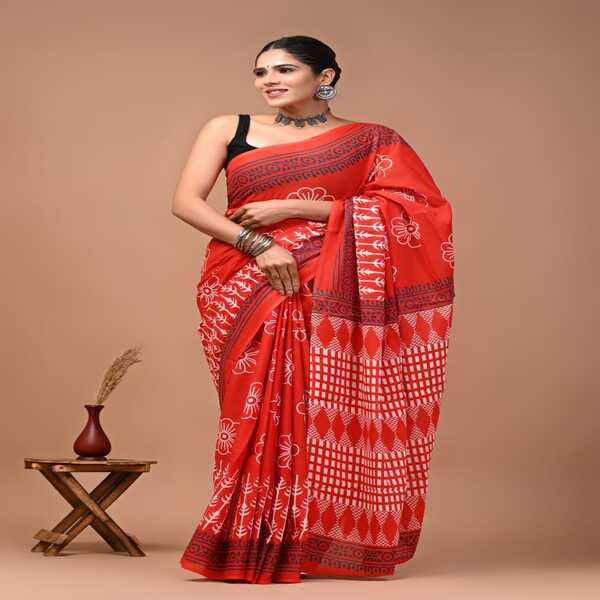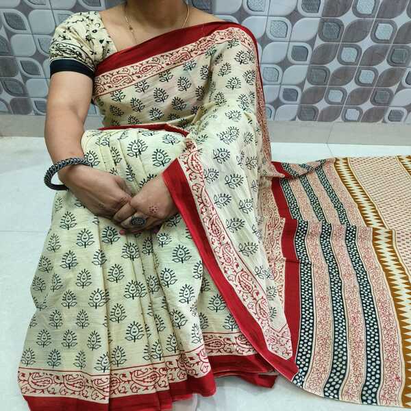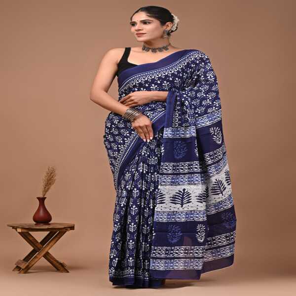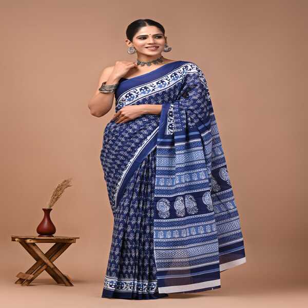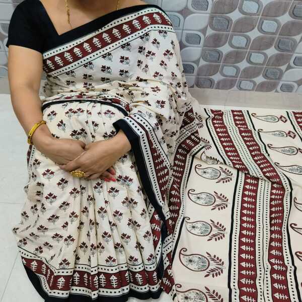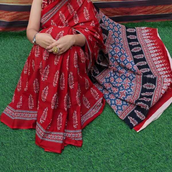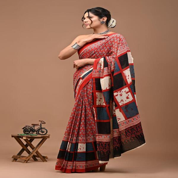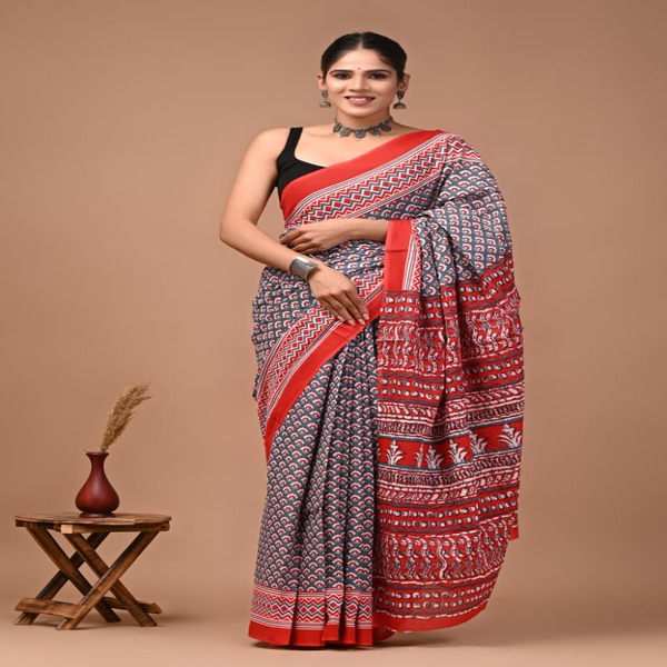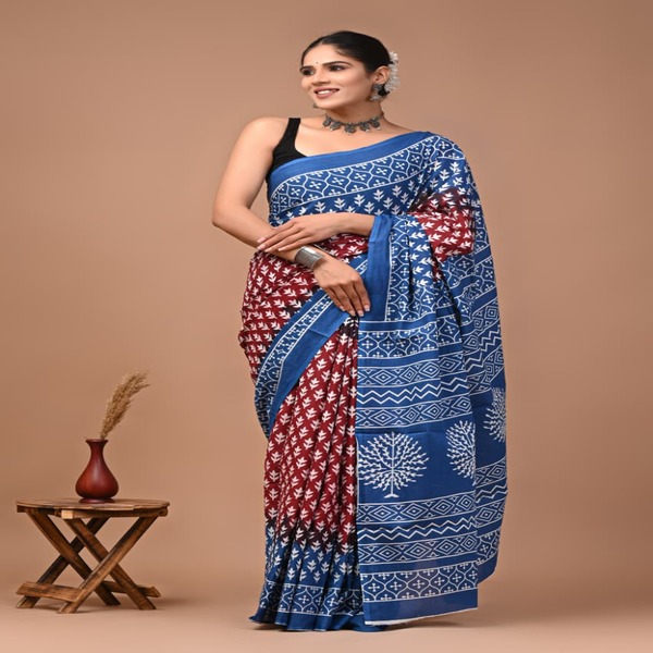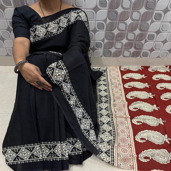 494 Piece Description : A Bagru Hand Block Printed Cotton Mulmul Saree Is A Lightweight Breathable Saree Crafted Using Traditional Indian Textile Techniques From The Village Of Bagru In Rajasthan. It Is Made From Mulmul Cotton A Very Fine Soft And Sheer Variety Of Cotton Known For Its Comfort And Airy Feel Making The Saree Ideal For Warm Weather The Fabric Drapes Gently And Feels Smooth Against The Skin. The Saree Features Hand Block Printing Where Skilled Artisans Carve Intricate Floral Paisley Or Geometric Motifs Onto Wooden Blocks And Stamp Them Onto The Fabric Using Natural Or Vegetable-based Dyes Typical Bagru Designs Use Earthy Colours Such As Indigo Red Black And Beige Often Inspired By Nature And Traditional Rajasthani Patterns. Location : Rajasthan, India