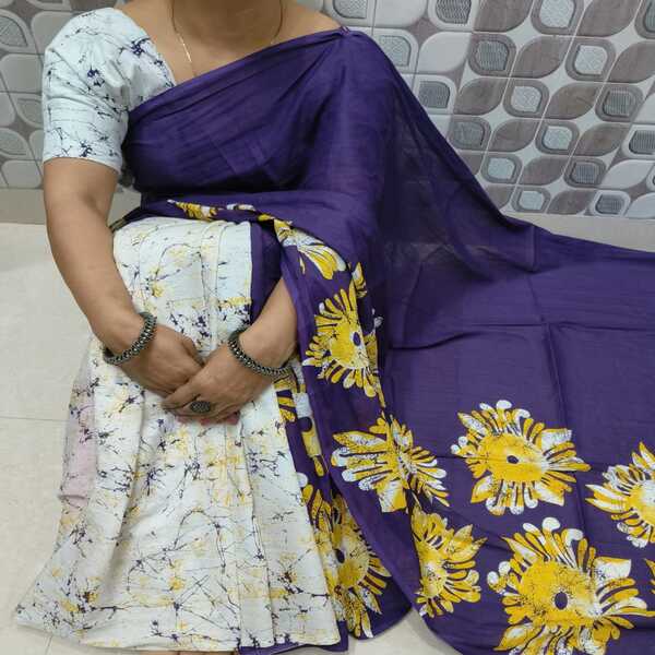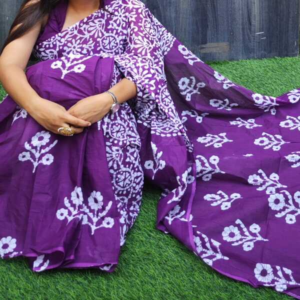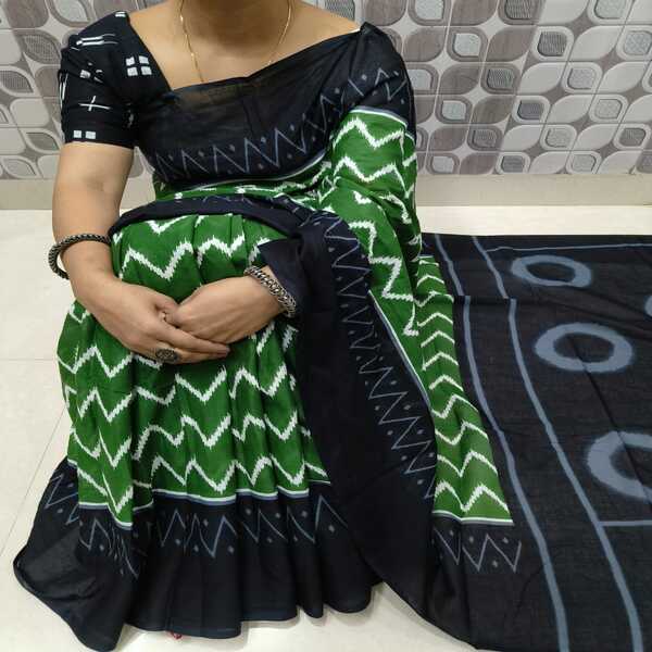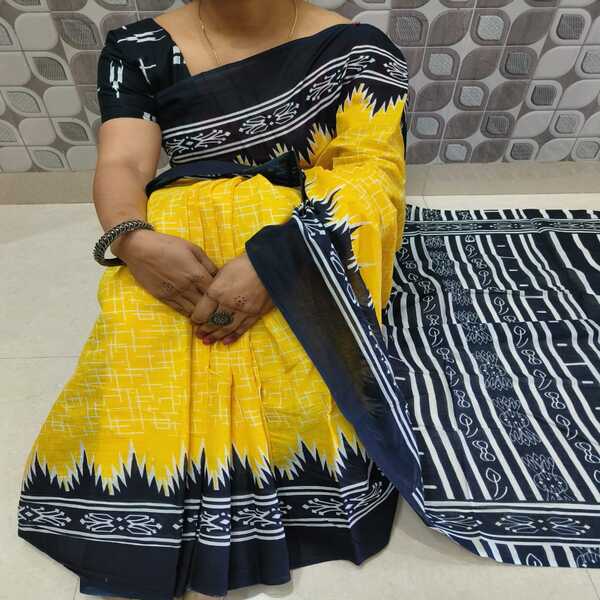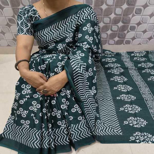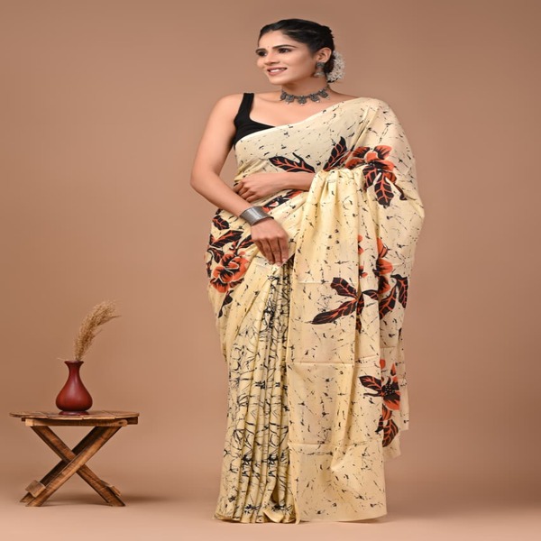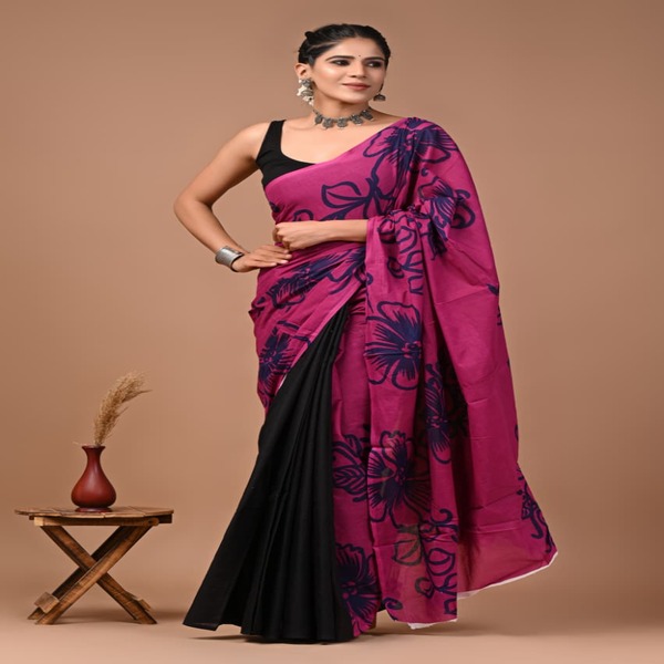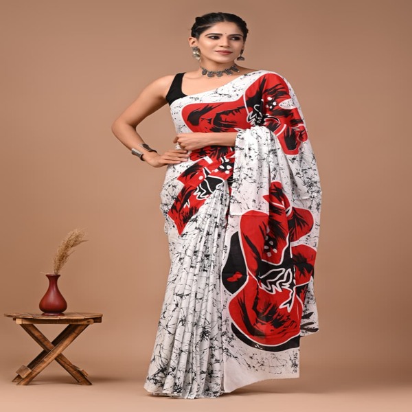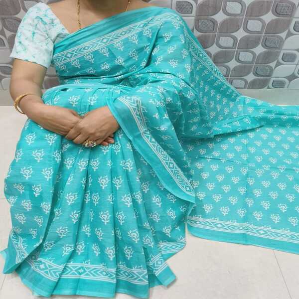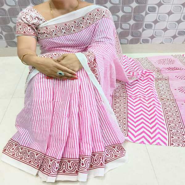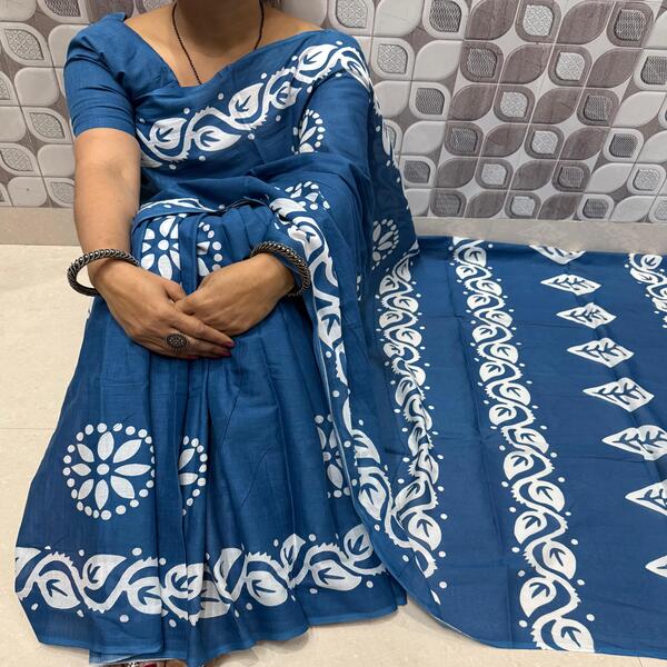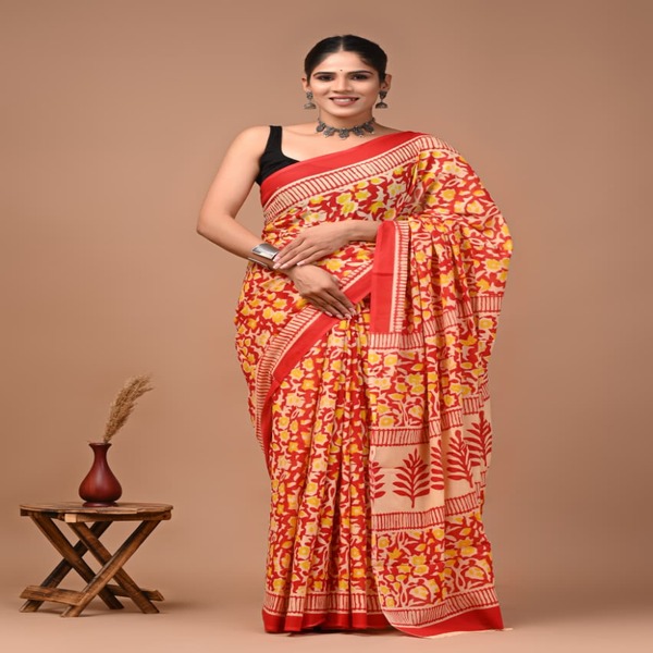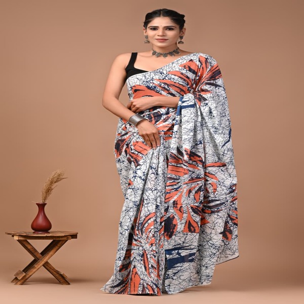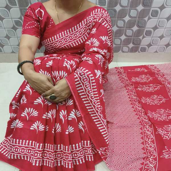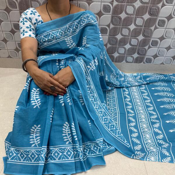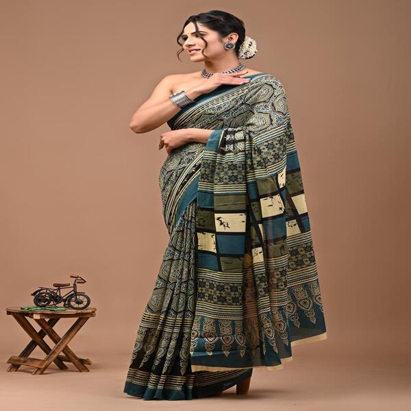 494 Piece Description : A Bagru Hand Block Printed Cotton Mulmul Saree Is A Lightweight Breathable Saree Crafted Using Traditional Indian Textile Techniques From The Village Of Bagru In Rajasthan. It Is Made From Mulmul Cotton A Very Fine Soft And Sheer Variety Of Cotton Known For Its Comfort And Airy Feel Making The Saree Ideal For Warm Weather The Fabric Drapes Gently And Feels Smooth Against The Skin. The Saree Features Hand Block Printing Where Skilled Artisans Carve Intricate Floral Paisley Or Geometric Motifs Onto Wooden Blocks And Stamp Them Onto The Fabric Using Natural Or Vegetable-based Dyes Typical Bagru Designs Use Earthy Colours Such As Indigo Red Black And Beige Often Inspired By Nature And Traditional Rajasthani Patterns. Location : Rajasthan, India