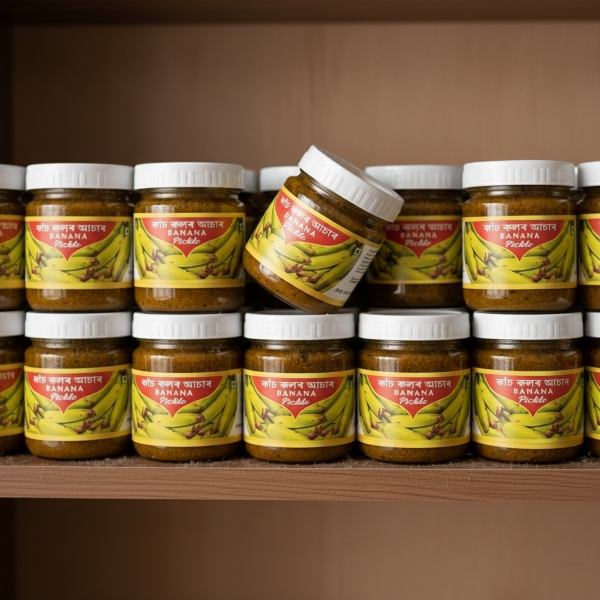 Green banana pickle is a tangy, spicy condiment made from unripe bananas, offering a firm, starchy texture and a unique flavour, unlike sweet ripe bananas; it is prepared by cooking green bananas and then marinating them in a flavourful brine of vinegar, chilies, garlic, mustard, and spices, serving as a zesty accompaniment to rice, meats, or other dishes in various cuisines, especially South Asian and Caribbean. Location : Assam, India