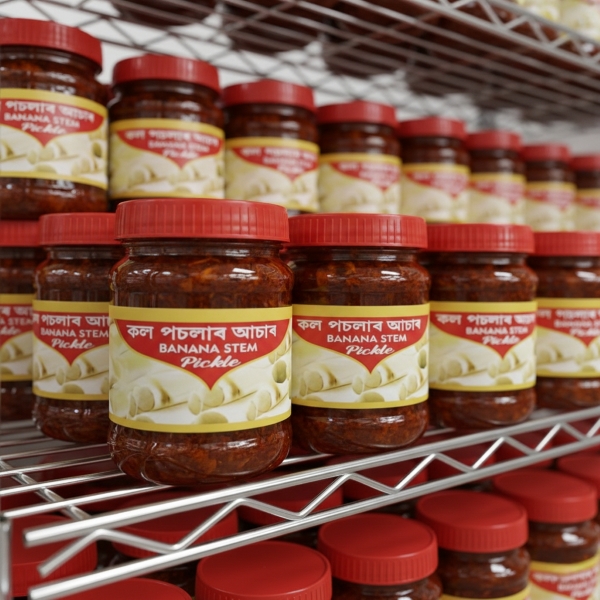 Banana stem pickle, or Vazhaithandu Achar, is a tangy, spicy, and savoury South Indian condiment made from the fibrous, crisp inner core of the banana plant, packed with fibre and nutrients, offering a unique texture with a blend of spices like mustard, fenugreek, chili, and asafoetida in a base of sesame oil, perfect as a zesty side for rice, roti, or curd rice, supporting digestion while adding a burst of flavour. Location : Assam, India