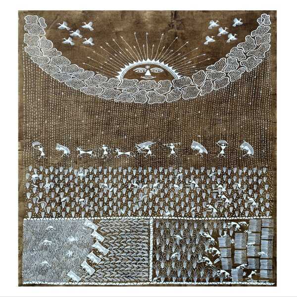 6050 Piece Description : Madhubani Paintings Of Hindu Mythology Are Vibrant Folk Artworks That Depict Scenes From The Ramayana And Mahabharata, As Well As The Exploits Of Gods Like Rama, Sita, Krishna, And Durga. Characterized By Bold Colours, Intricate Lines, And Symbolic Motifs Like Fish, Peacocks, And Lotuses, These Paintings Are Filled With Expressive, Stylized Figures And Are Often Composed With Double-line Borders And No Empty Spaces. Location : Bihar, India