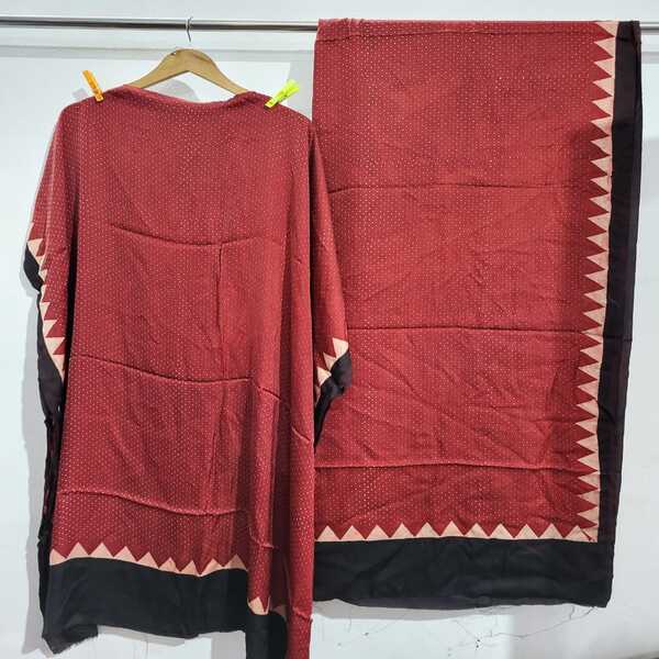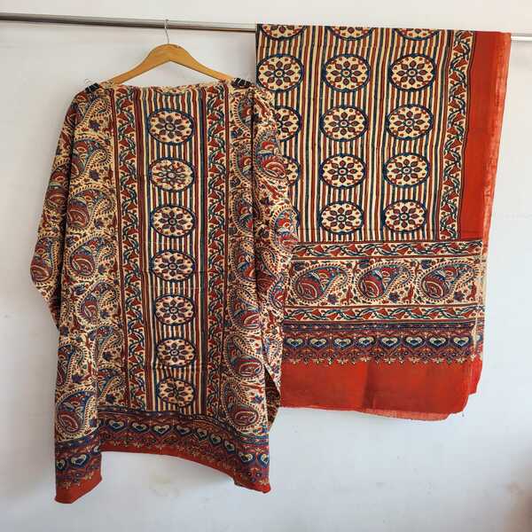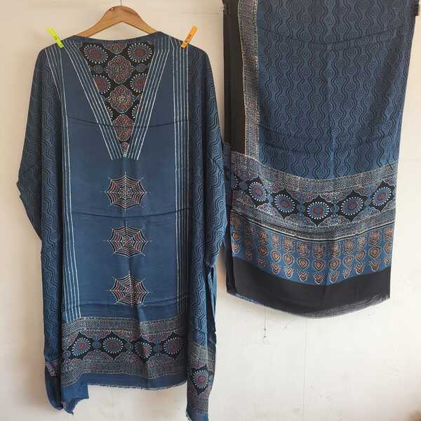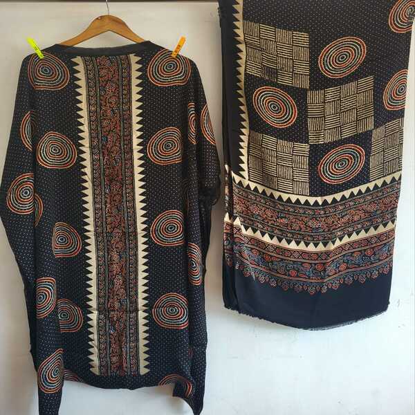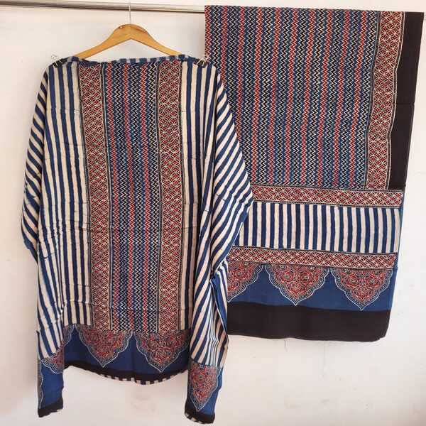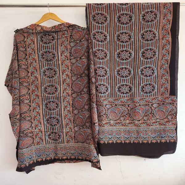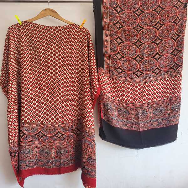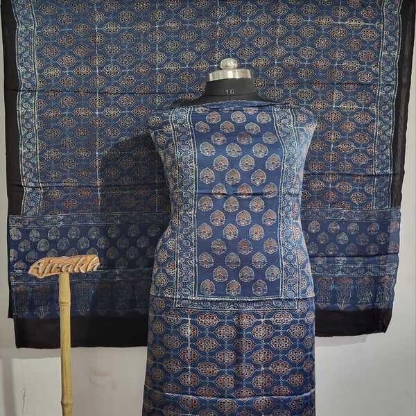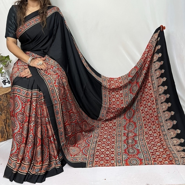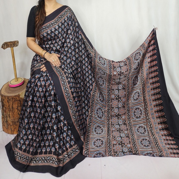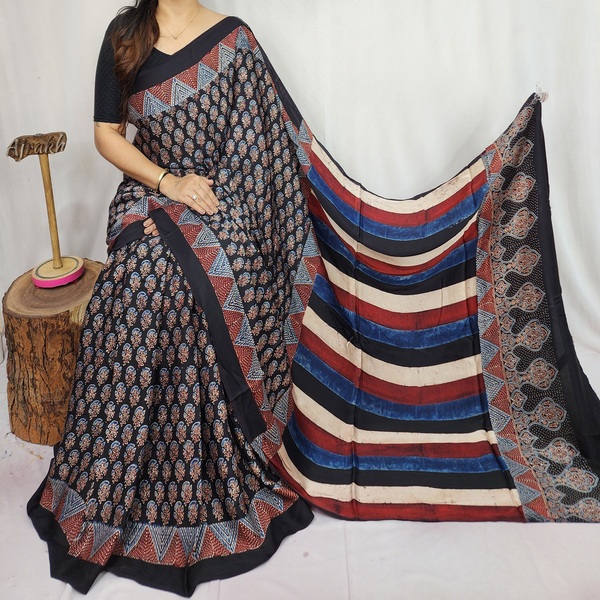 2860 Piece Description : A Hand Block Printed Ajrakh Modal Saree Is A Hand-crafted Textile Featuring Intricate, Geometric Or Floral Patterns, Created Using Traditional Wooden Blocks And Natural Dyes On A Fabric Blend Of Modal And Rayon-cotton. The Process Involves Layering Blocks, With Each Colour And Pattern Applied Separately, And Requires Multiple Rounds Of Printing And Sun-drying. The Resulting Saree Is Known For Its Soft Drape, Unique Earthy And Bold Aesthetic, And The Unique Variations That Come From Being Entirely Handmade. Due To The Handmade Nature Of The Process, Each Saree Has Slight Variations, Making It A Unique Piece Of Wearable Art. Location : Gujarat, India