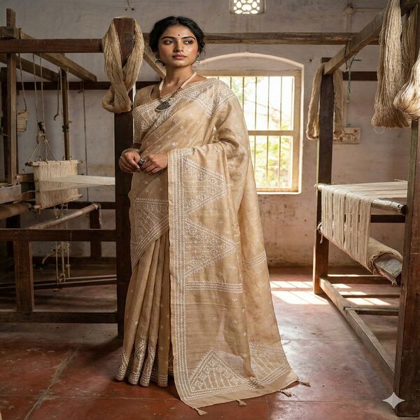 4950 Piece Description : A Pure Check Zari Tussar Silk Saree Is A Handwoven Saree Made From Pure Tussar Silk, Known For Its Natural Golden Sheen And Coarse Texture. It Is Characterized By Woven Zari (gold Thread) Checks Throughout The Body Of The Saree, Often With A Contrasting Zari Border And A Matching Or Complementary Zari Pallu. These Sarees Are Lightweight Yet Durable And Drape Beautifully, Making Them Suitable For Both Special Occasions And Daily Wear. Location : West Bengal, India