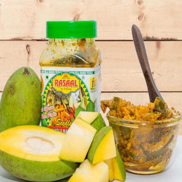 Ramkela Mango Pickle is a traditional North Indian condiment made from raw, firm, and tangy Ramkela mangoes, renowned for their superior texture in pickling. It features a robust, savoury flavour profile—tangy, spicy, and often slightly sweet—infused with mustard oil and aromatic, blended spices. It offers significant health benefits, including high vitamin C, A, and E content that boosts immunity and enhances skin health. It aids digestion, provides antioxidant properties, and supports metabolism. Ramkela mangoes are exclusively grown for pickling due to their unique flavour, making this pickle a deeply aromatic and tasty, yet healthy, addition to meals. Location : Haryana, India