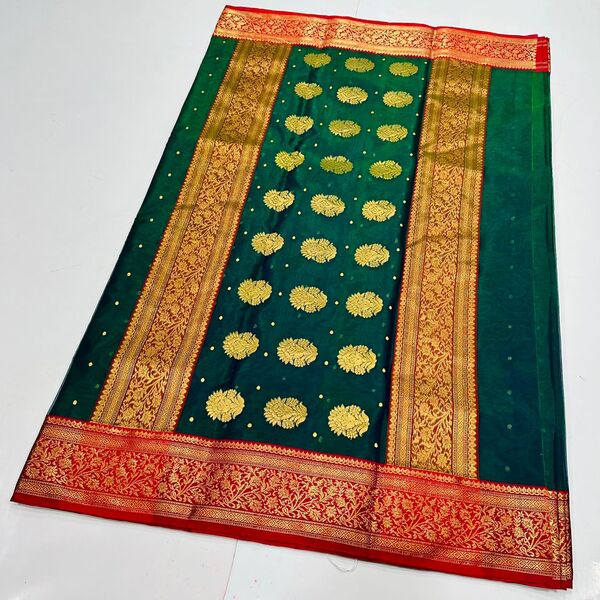 8800 Piece Description : A Chanderi Handloom Katan Silk Saree Is A Luxurious, Lightweight Saree From Chanderi, Madhya Pradesh, Known For Its Blend Of Fine Silk (katan) Threads Woven On A Handloom, Creating A Subtle Sheen, Soft Texture, And Durability, Often Featuring Traditional Motifs Like Coins, Flowers, Or Peacocks With Intricate Zari Work, Perfect For Festive Elegance. It Combines The Lightness Of Chanderi Fabric With The Richness Of Pure, Twisted Silk (katan), Showcasing Traditional Craftsmanship With Unique Patterns And A Distinct Luster, Making It A Prized Heirloom Piece. Location : Madhya Pradesh, India
