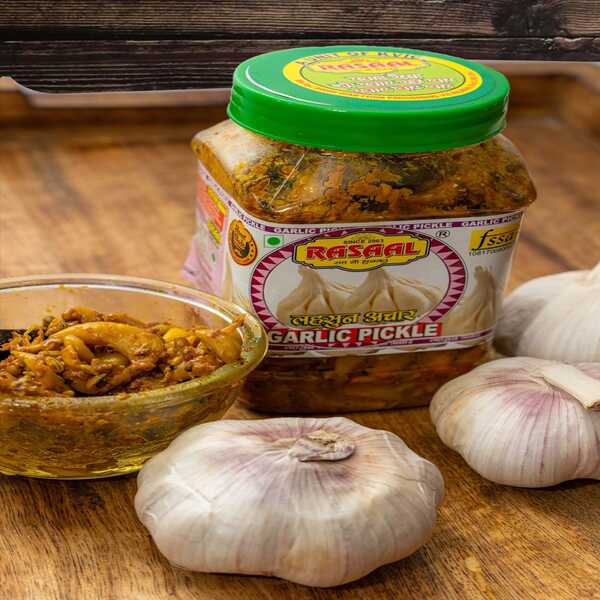 Garlic pickle (Lahsun ka Achaar) is a pungent, spicy, and tangy Indian condiment made by curing garlic cloves in oil (usually mustard or sesame) with spices like red chili, turmeric, and mustard seeds. It offers a crunchy texture and intense flavour, often featuring a sweet, savoury, or sour undertone. It is commonly used as a flavourful, appetite-boosting accompaniment to dishes like rice, roti, and paratha. It is a nutrient-dense, flavourful condiment packed with antioxidants, vitamins, and active compounds like allicin, offering significant health benefits. Regular, moderate consumption helps boost immunity, improve digestion, reduce inflammation, and support heart health by managing cholesterol and blood pressure. Location : Haryana, India