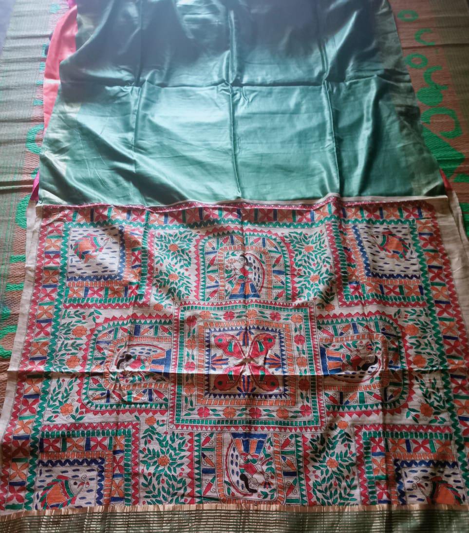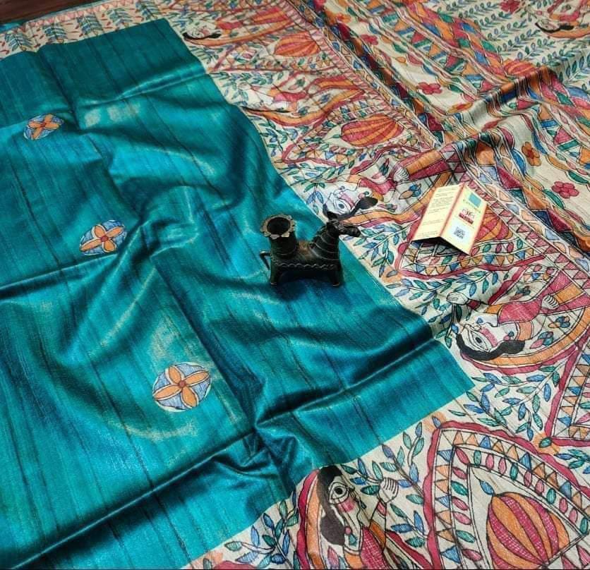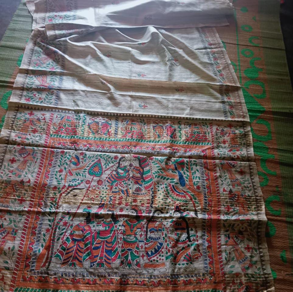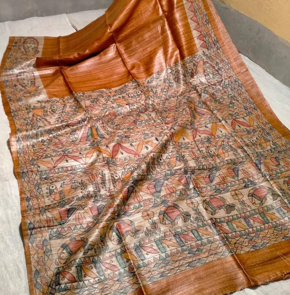 5005 Piece Description : A Ghicha Madhubani Saree Is A Saree Made From Ghicha Silk Fabric And Featuring A Madhubani Paint Pattern. Ghicha Silk Is A By-product Of Tussar Silk, And Is Extracted From The Cocoons That Remain After Reeling Tussar Silk. Ghicha Silk Is Rough But Smooth To The Touch And Has A Lustrous Silk Sheen. Location : Jharkhand, India