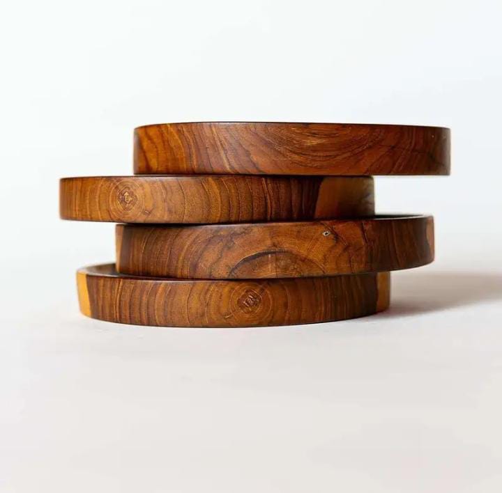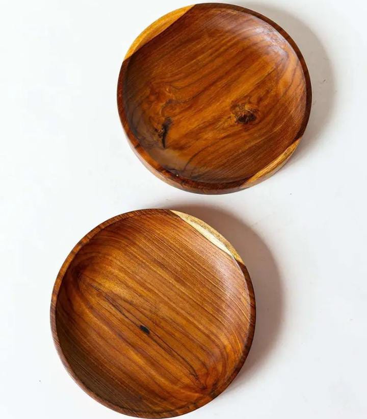 2001 No. Description : Teak Wood Round Plate. Made Of Single Wood Block(no Joints). Handmade By Tribal Artisans Of Nagaland. Bring Natural And Bohemian Vibes To Your Table Settings And Decor.use It To Serve Or As A Decor Accent. Location : Uttar Pradesh, India