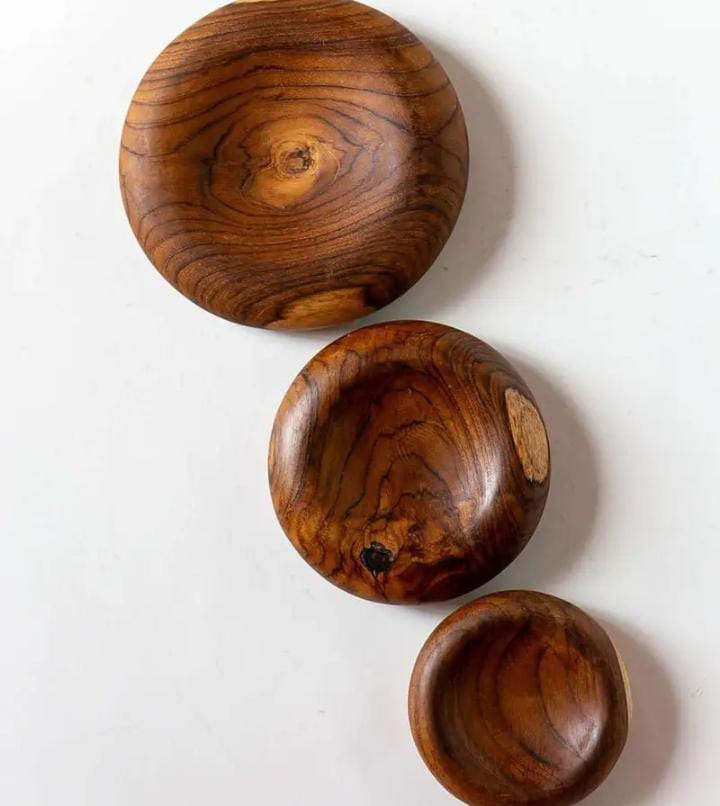 770 No. Description : Teak Wood Decor Bowls Set Of 3. Made Of Single Wood Block(no Joints). Handmade By Tribal Artisans Of Nagaland. Bring Natural And Bohemian Vibes To Your Table Settings And Kitchen. Use Them As Dining Table Or Coffee Table Decor. Location : Uttar Pradesh, India