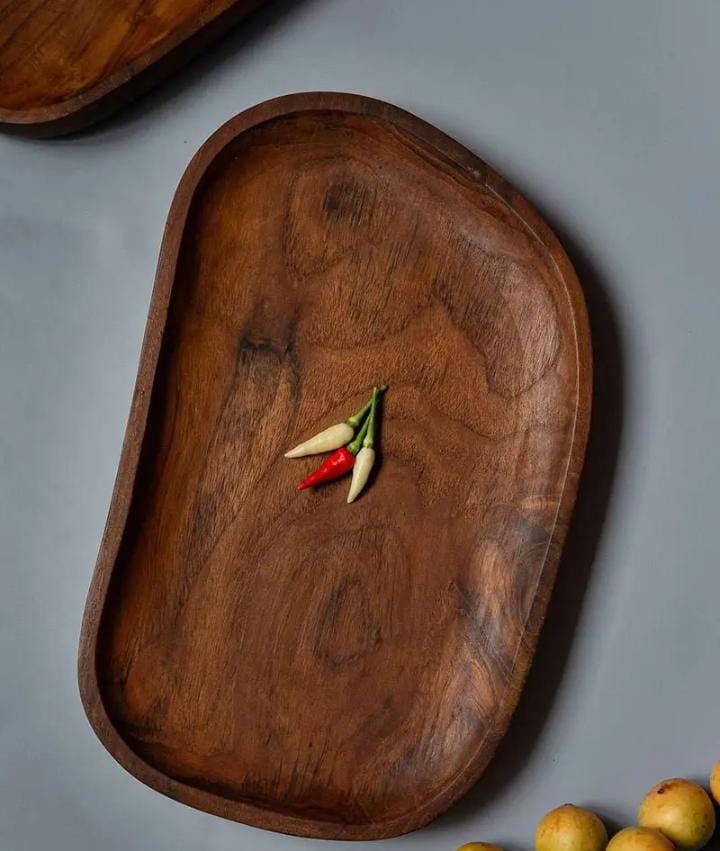 1050 No. Description : Teak Wood Irregular Decor Plate Set Of 2. Made Of Single Wood Block(no Joints). Handmade By Tribal Artisans Of Nagaland. Bring Natural And Bohemian Vibes To Your Table Settings And Decor. Location : Uttar Pradesh, India