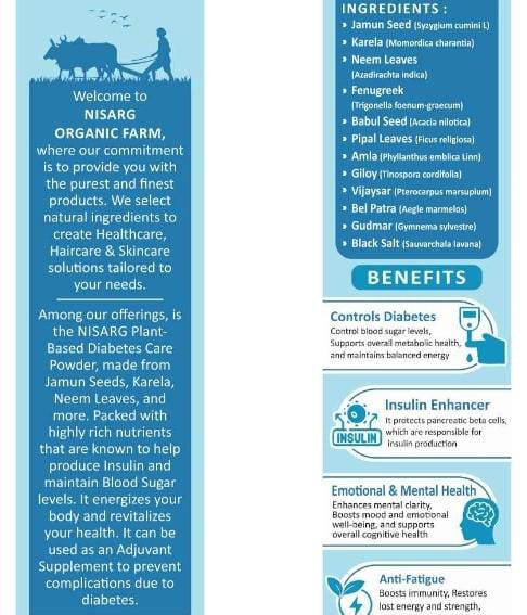 279 Packet Net Weight : 100 Gram Description : Diabetes Care Helps In Controlling The Blood Sugar Level Of Your Restores Your Best Energy Strength And Vigation Be Used As An Adjuvant Supplement Arevent Complications Cut To Diabetes. The Daibetes Care Powder 100% Safe Is And Natural, And Hygienically Packaged Under Expert Supervision.jamun Seed Powder, Karela Powder, Babul, Pipal Leaves, Amla, Giloy, Bel Patra Vijaysar Powder, Fenugreek, Gudmar, Neem Leaves Powder, Kala Namak. Location : Gujarat, India