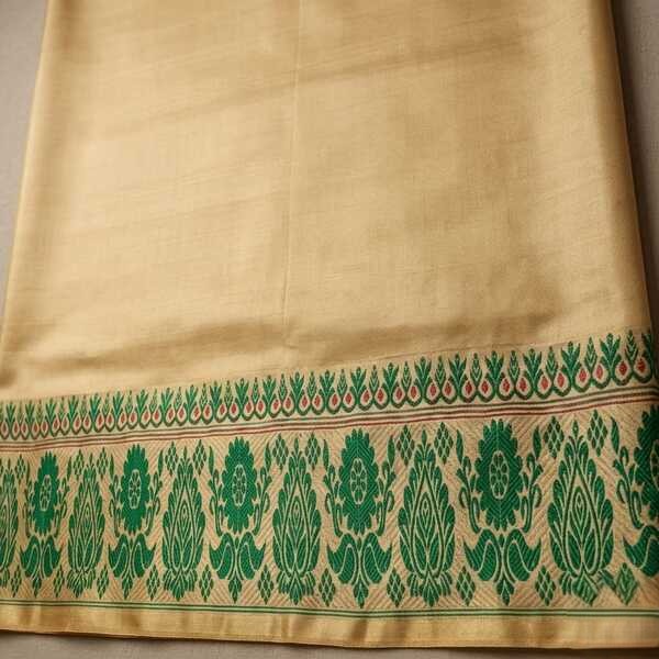 A single mekhela is a traditional Assamese garment worn by women, typically made from various fabrics such as cotton, silk, or synthetic materials. It consists of a single piece of fabric wrapped around the waist, often featuring intricate handwoven designs and patterns. The mekhela is an essential part of Assamese attire, especially during festivals and cultural events. Location : Assam, India