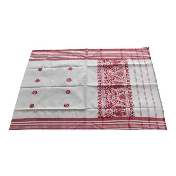 The specialty of the Assamese Gamosa lies in its cultural significance as a symbol of respect and hospitality, a traditional handwoven cotton cloth, and its versatile use for wiping, gifts, and ceremonial purposes. Location : Assam, India