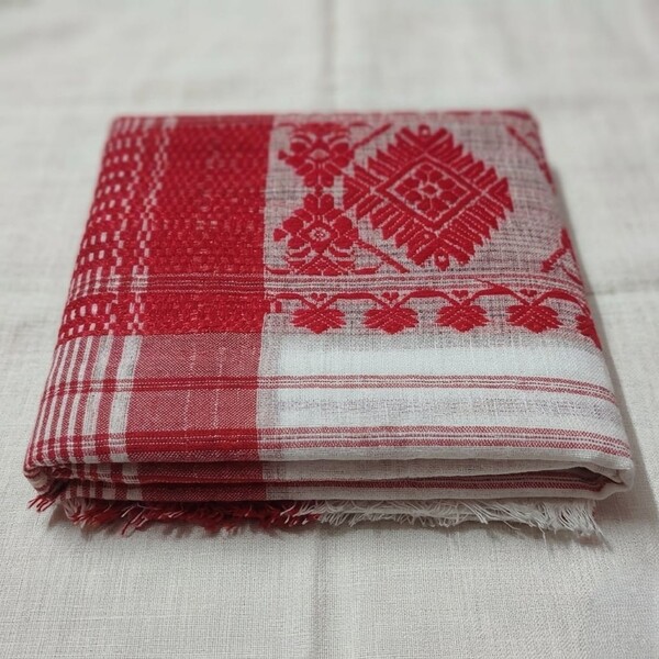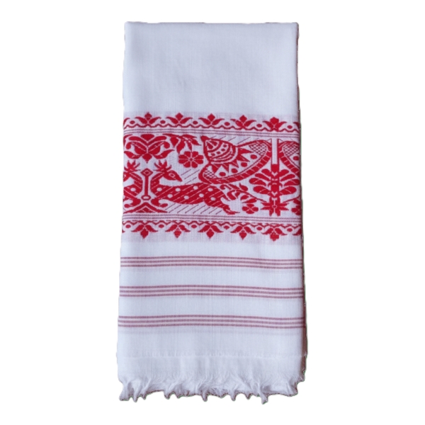 The Gamosa, a culturally significant handwoven cloth from Assam, is a white rectangular piece of fabric with red or maroon borders and often features intricate woven motifs, serving as a symbol of respect, hospitality, and cultural identity. Location : Assam, India